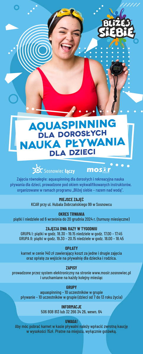 Zapraszamy Państwa do dokonywania zapisów na ostatni, grudniowy turnus zajęć aquaspinning dla dorosłych i rekreacyjnej nauki pływania dla dzieci. Zapisy odbywać się będą wyłącznie za pośrednictwem strony internetowej w dniach od 21 do 29 listopada 2024r.